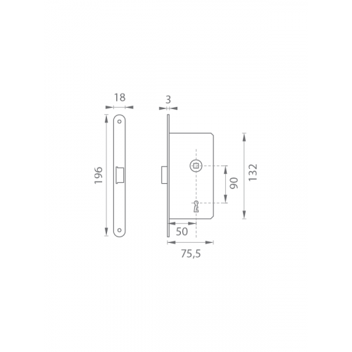 Magnetický zámok do dverí s otvorom s otvorom pre interiérový kľúč (BB) s rozmermi čela zámku v dĺžke 196 mm, šírke 18 mm. Rozteč (vzdialenosť medzi otvorom na kľučku a vložkou/kľúčom) - 90 mm , zádlab - 75,5 mm a dormas (vzdialenosť osi kľučky od lišty zámku) - 50 mm.