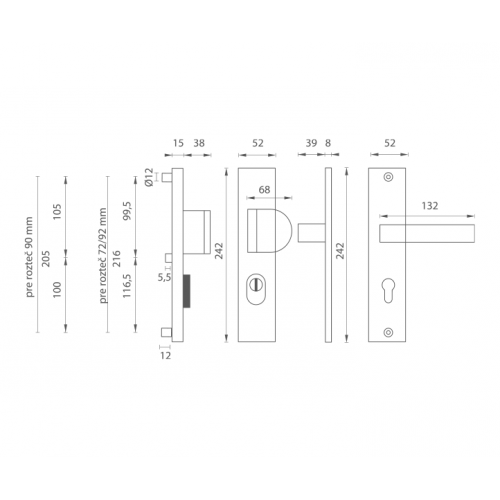 Pri bezpečnostnom kovaní je potrebné poznať vzdialenosť medzi osou kľučky a osou kľúča (rozteč). Štandardná vzdialenosť je 72, 90 alebo 92 mm. Kovanie s roztečou 72 a 90 mm je štandardom pre hrúbku dverí od 38 mm do 50 mm. Kovanie s roztečou 92 mm je štandardom pre hrúbku dverí od 68 mm do 78mm.