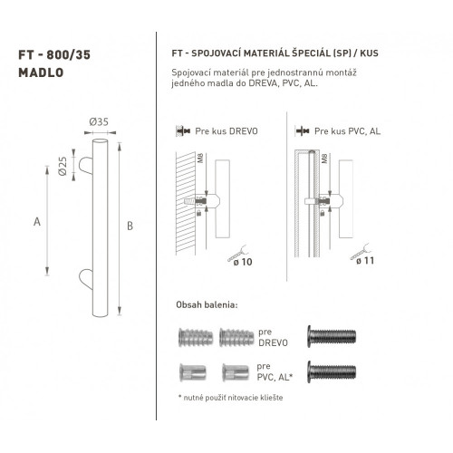 Madlo na dvere je vyrobené z vysokokvalitnej nehrdzavejúcej ocele, známej ako nerez a je povrchovo upravené. Profil madla je 35 mm. Sada ŠPECIÁL (SP) obsahuje spojovací materiál pre jednostrannú montáž jedného madla do dreva, PVC, AL.