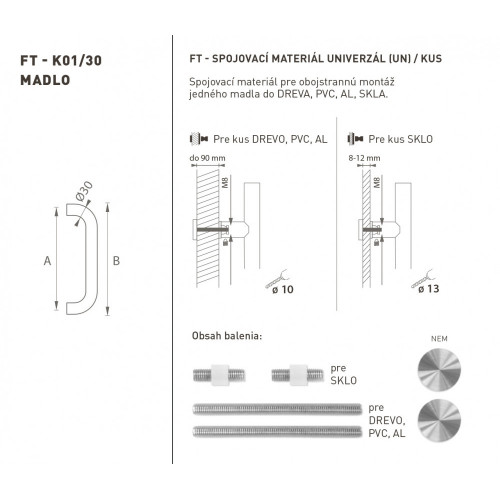 Sada UNIVERZÁL (UN) obsahuje spojovací materiál pre obojstrannú montáž jedného madla do dreva, PVC, AL, sklo.