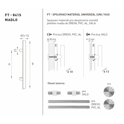 Madlo na dvere je vyrobené z vysokokvalitnej nehrdzavejúcej ocele, známej ako nerez a je povrchovo upravené. Profil madla je 40 x 10 mm. Sada UNIVERZÁL (UN) obsahuje spojovací materiál pre obojstrannú montáž jedného madla do dreva, PVC, AL, sklo.