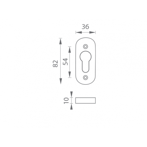 Úzka oválna rozeta je vyrobená z hliníka a je povrchovo upravená. Rozeta má otvor pre cylindrickú vložku (PZ). Balenie obsahuje 2 kusy roziet (pár). Rozeta má rozmery 36 x 82 mm a hrúbku 10 mm.