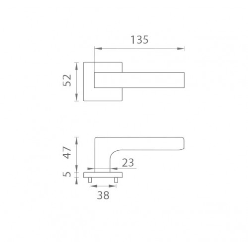 Rozetová kľučka na interiérové dvere s hranatou rozetou je vyrobená z materiálov vysokej kvality - zamak a je povrchovo upravená. Rozeta má rozmer 52x52 mm a hrúbku len 5 mm. Minimalistický dizajn rozety s vysokou stabilitou kľučky na dverách pôsobí jemne, a tým ponecháva priestor pre vyniknutie dizajnu samotnej kľučky.