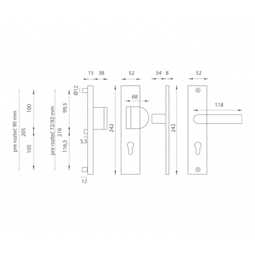 Pri bezpečnostnom kovaní je potrebné poznať vzdialenosť medzi osou kľučky a osou kľúča (rozteč). Štandardná vzdialenosť je 72, 90 alebo 92 mm. Kovanie s roztečou 72 a 90 mm je štandardom pre hrúbku dverí od 38 mm do 50 mm. Kovanie s roztečou 92 mm je štandardom pre hrúbku dverí od 68 mm do 78mm.