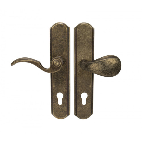 Štítová kľučka na vchodové a bezpečnostné dvere so spevneným rustikálnym štítom bez prekrytia cylindrickej vložky je vyrobená z materiálov vysokej kvality – mosadz a je povrchovo upravená. Rustikálny štít má rozmery 51 mm x 250 mm a hrúbku 12 mm.