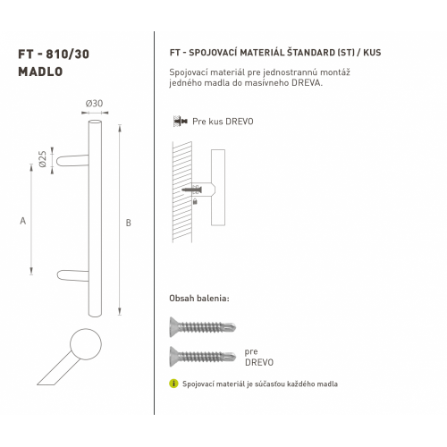 Madlo na dvere je vyrobené z vysokokvalitnej nehrdzavejúcej ocele, známej ako nerez a je povrchovo upravené. Profil madla je 30 mm. Súčasťou madla sú vruty 6 x 45 mm. Madlo s dĺžkou 1600, 1800 a 2000 mm má 3 úchyty. Tretí úchyt je umiestnený v strede.