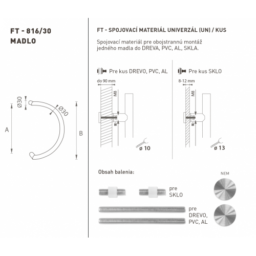 Madlo na dvere je vyrobené z vysokokvalitnej nehrdzavejúcej ocele, známej ako nerez a je povrchovo upravené. Profil madla je 30 mm. Sada UNIVERZÁL (UN) obsahuje spojovací materiál pre obojstrannú montáž jedného madla do dreva, PVC, AL, sklo.