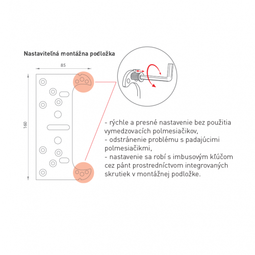 - nastavenie sa robí s imbusovým kľúčom cez pánt prostredníctvom integrovaných skrutiek v montážnej podložke
