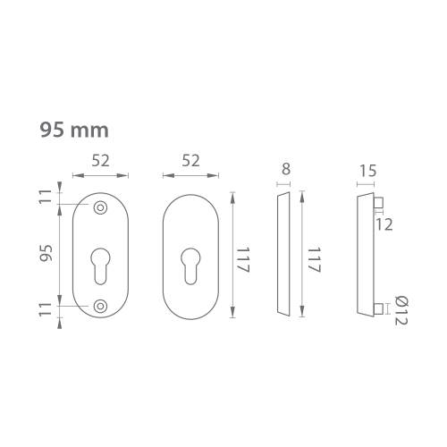Prídavná rozeta s PZ otvorom pre vložku so vzdialenosťou otvorov pre skrutky 95 mm má celkovú dĺžku 117 mm a hrúbku 15 mm.