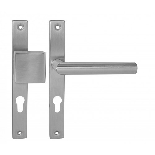 Štítová kľučka na interiérové dvere s úzkym hranatým štítom je vyrobená z vysokokvalitnej nehrdzavejúcej ocele, známej ako nerez a je povrchovo upravená.