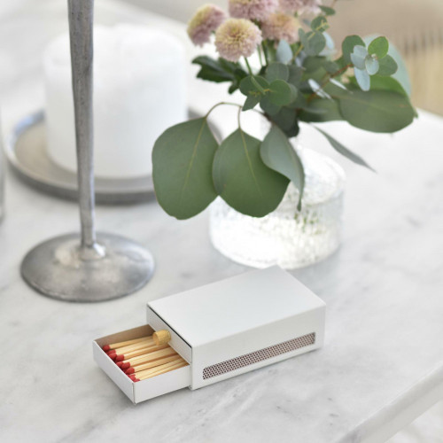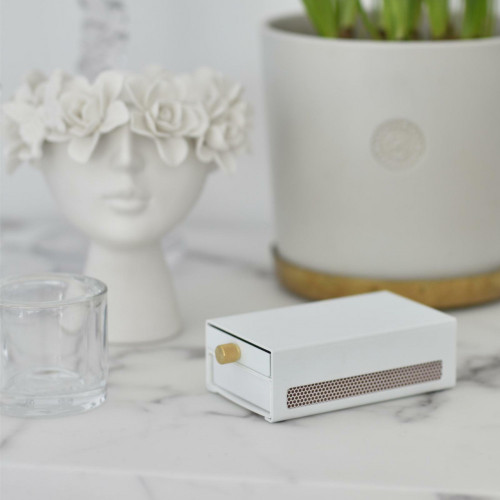 Neskrývajte svoje zápalky, vystavte ich v tomto elegantnom dizajnovom obale. Kovový obal obsahuje dve zásuvky. Vrchná kovová zásuvka je ozdobená zlatou úchytkou, ktorá je určená na použité zápalky. Keď sa zaplní, jednoducho zásuvku vytiahnete a obsah vysypete do odpadu. V druhej zásuvke je umiestnená zápalková krabička obsahujúca 50 ks dlhých švédskych zápaliek.
