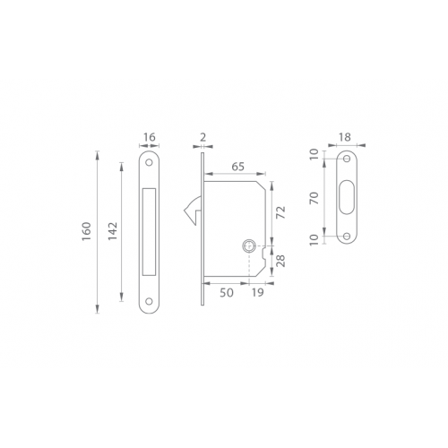 Zámok na posuvné dvere s otvorom pre WC kľúč s rozmermi čela zámku v dĺžke 160 mm, šírke 16 mm, hrúbke 2 mm. Rozteč (vzdialenosť medzi otvorom na kľučku a vložkou/kľúčom) - 70 mm , zádlab - 65 mm a dormas (vzdialenosť osi kľučky od lišty zámku) - 50 mm. Protiplech má rozmery 18 mm x 90 mm a je súčasťou balenia.