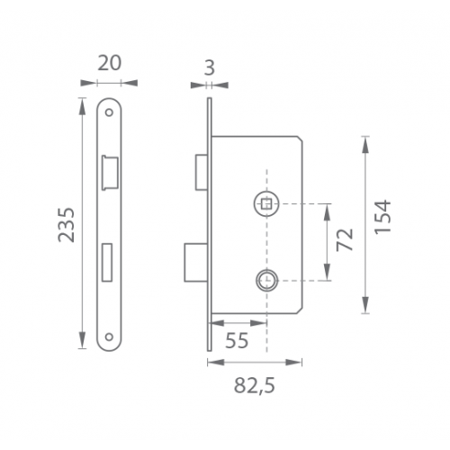 Zadlabávací dvojzápadkový zámok do dverí s otvorom pre WC kľúč (WC) s rozmermi čela zámku v dĺžke 235 mm, šírke 20 mm, hrúbke 3 mm. Rozteč (vzdialenosť medzi otvorom na kľučku a vložkou/kľúčom) - 72 mm , zádlab - 82,5 mm a dormas (vzdialenosť osi kľučky od lišty zámku) - 55 mm.