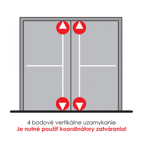 Dvojkrídlové dvere so štvorbodovým zaistením D2/ 2H-2D – 4-bodové vertikálne uzamykanie, je nutné použiť koordinátory zatvárania a samozatvárač, sú určené pre protipožiarne a dymotesné dvere.