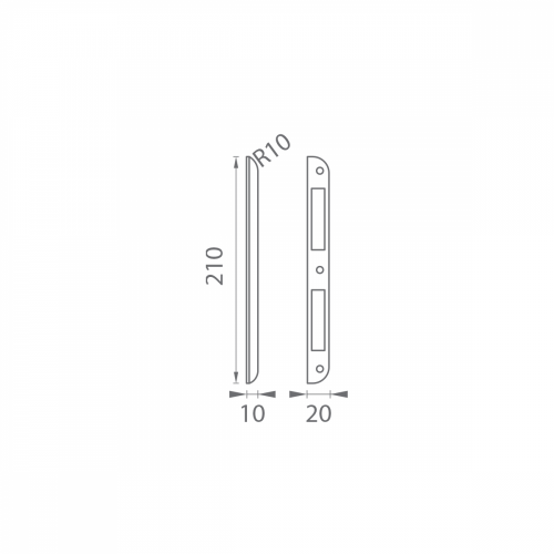 Protiplech lomený so zaoblenými rohmi k zámku F18 L/2xR má rozmery 20 mm x 210 mm a hrúbku 10 mm.