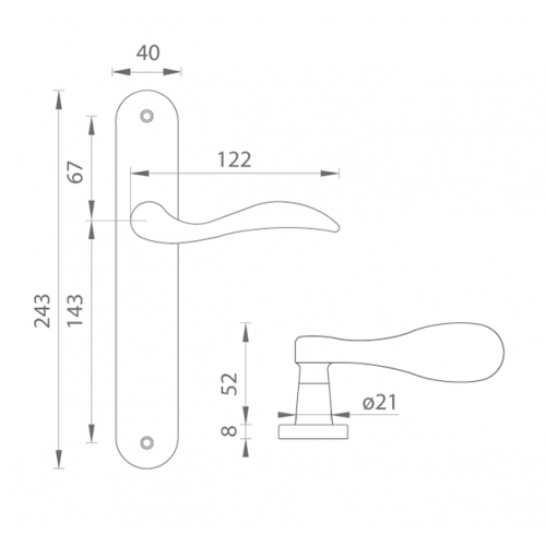 Štítová kľučka na interiérové dvere s oválnym štítom je vyrobená z materiálov vysokej kvality - mosadz a je povrchovo upravená. Oválny štít má rozmery 40 mm x 243 mm a kľučka obsahuje vratný mechanizmus.