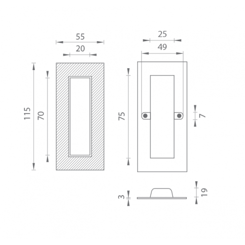 Hranatá mušľa na posuvné dvere je vyrobená z materiálov vysokej kvality – zamak a je povrchovo upravená. Mušľa má výšku 115 mm, šírku 55 mm, zádlab 16 mm a celkovú hrúbku 20 mm. Upevnenie samoreznou skrutkou - Súčasťou balenia sú samorezné skrutky v príslušnom počte. Montáž krytky, mušle na magnet. Cena je uvedená za kus.